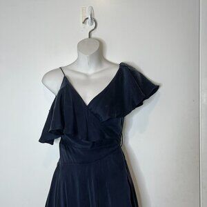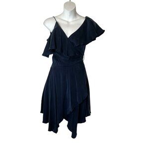 A chic navy wrap dress with cascading ruffles, perfect for evening wear. Crafted with an asymmetrical hemline for added elegance.