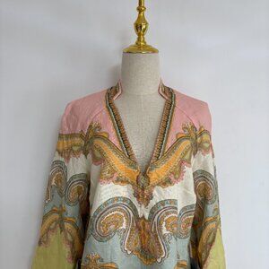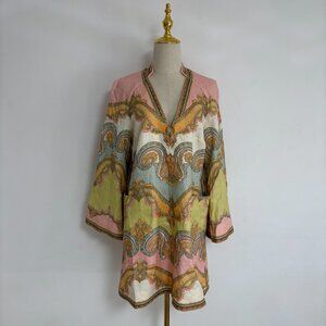 Elegant mini dress with pastel patterns. Features a V-neck and wide sleeves. Perfect for a chic look.