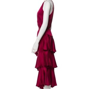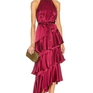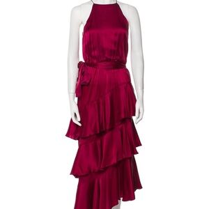 This stunning Zimmermann gown features a sleeveless halter neckline and a striking asymmetrical, tiered ruffle skirt. The vibrant pink hue makes it perfect for a wedding guest or cocktail occasion, ensuring you stand out with elegance and style.