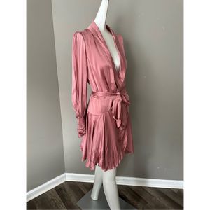 Elegant pink satin mini dress. Features a wrap design with a tie waist. Long sleeves with ruched cuffs.