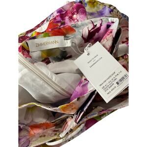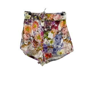 Zimmermann 'Prima' Pink Silk High Waisted Short Size 1: mid-weight, non-stretch silk charmeuse, floral print, high-rise silhouette, self-belt at waist and hidden zip at back, on-seam side pockets, measurements: 14 inch width x 2 inch inseam.