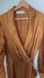 Luxurious Silk wrap dress with long sleeves. Features a rich gold hue. Perfect for elegant occasions. Size 2 , fits M (8-10)