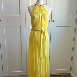 Chic yellow midi dress with halter neckline. Features pleated design and elegant drape. Ideal for stylish outings.