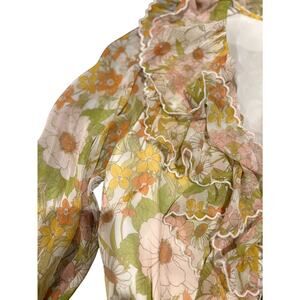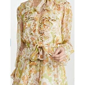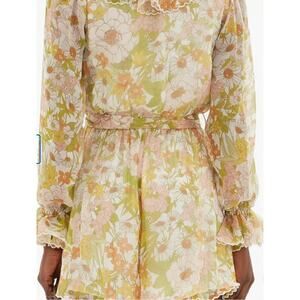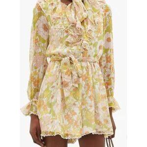Zimmermann's green floral-print Super Eight playsuit is reminiscent of 1970s silhouettes. It's crafted from silk georgette to a loosely draped ruffled silhouette with scalloped edges and is cinched with a waist tie. Style it with a basket bag and slides to channel a beachfront mood.