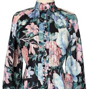 The Zimmermann Verity Rouleau Short Dress is a soft feminine dress for your daytime event. This floral linen dress features an a-line skirt, blouson sleeves, high neckline, front button closure and centre back invisible zipper.