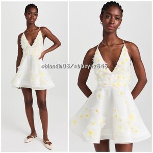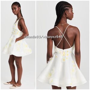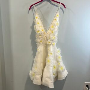 Elegant white dress with delicate floral embellishments. Features yellow accents for a fresh look. Perfect for special occasions.