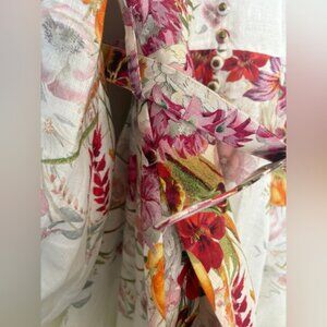 The Wonderland Buttoned Mini in Elka Poppy Ivory Border from the Zimmermann Spring 2023 Collection, Wonderland. A linen mini dress featuring a stand collar and exaggerated sleeves. - Linen mini dress- Flower buttons down centre front- Blouson sleeves with elastic cuffs- Removable belt- Style code: 6618DWON