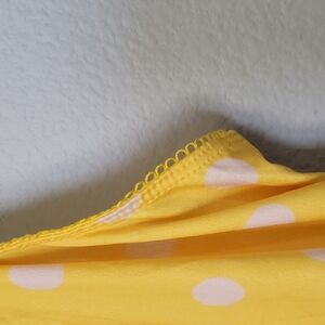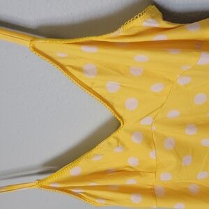 Bright yellow with white polka dot pattern. Feels amazingly soft and slinky and does stretch. Has a loop/scallop like trim around the chest that also wraps around the back. Gold colored hardware on the straps. Adjustable straps. V neck. Minimally sheer, lightweight fabric. Great condition, just a little wrinkled from storage. Designer. y2k, 00's look. Please see measurements to determine sizing. According to size chart this was approximate a size 10, I'm listing as a medium. Camisole. Spring, summer, dopamine, festival, concert, hanging out, casual, cute, flirty, girly, statement,bold, romantic, dainty, picnic, dinner, sweet, twee, soft girl, coquette