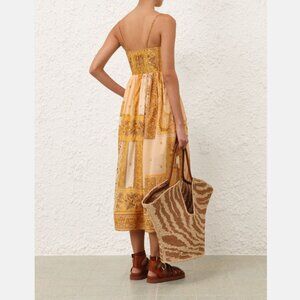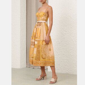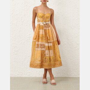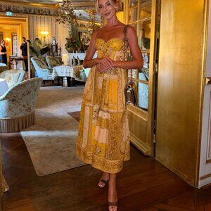 Elegant midi dress with a fitted bodice. Features a vibrant yellow and cream pattern. Perfect for summer occasions.