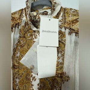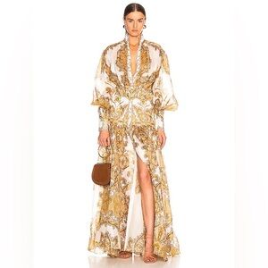 The intricate gold paisley print is woven into the semi-sheer lightweight fabric, creating a regal aesthetic that flows effortlessly with every step. The dress fastens with covered buttons down the front and is partially lined for modesty. Designed in Zimmermann’s signature bohemian-luxe style, this piece is ideal for special events, weddings, or as a standout editorial look.