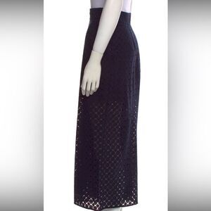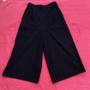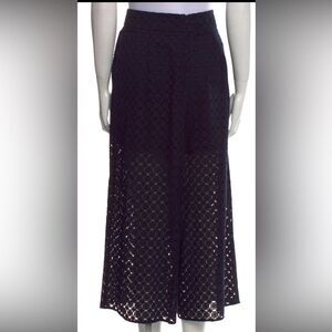 These Zimmermann wide-leg pants in classic black feature a high-waisted design and a unique eyelet pattern that adds a touch of modern elegance. The flowing silhouette and textured fabric offer both comfort and style, making them a versatile addition to any wardrobe. New, no tags