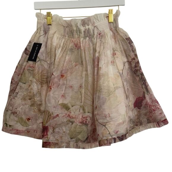 This Zimmermann mini skirt features a playful bubble style with a smocked waistband, perfect for casual or resort wear. The cream and pink hues create a soft, feminine look, while the airy fabric ensures comfort and movement.