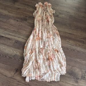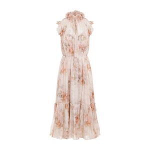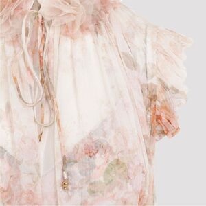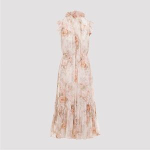 Zimmermann Illustration Flutter Pink Viscose Midi Dress. Crafted from semi-sheer pink viscose, Cream Rococo Floral pattern all over, short sleeves with frills, round collar with self-tie closure and floral details, fine tonal tie belt at the waist, flounces at the hem, midi length, partially lined.