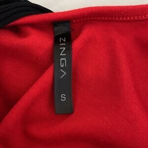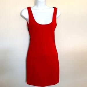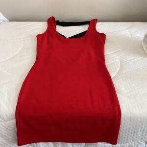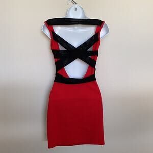 This is a body con dress by Zynga. It’s a red dress with a black straps for a sexy backless look.