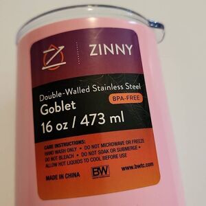NWT Zinny double walled stainless steel 16oz goblet... light pink with white graphics