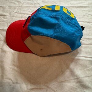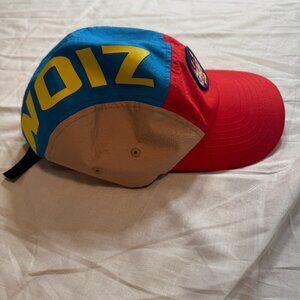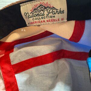 Red, blue, and tan with ZION in yellow letters on the top. Zion National Park patch on the middle of the hat. Red bill. 100 percent polyester that feels like it would be quick drying. Black strap in the back to adjust to fit. Inside has a patch with "National Parks Collection by American Needle Inc."
