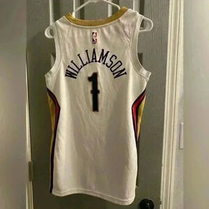 Zion Williamson Mens 40 Small New Orleans Pelicans Nike Swingman Jersey NBA v neck, tagless neck. Officially licensed product. 100% recycled polyester. Machine Washable. Made with Dri Fit technology. Has a small pull on front above the W. If you sew it can be pulled through. P2P 18 in length 28 in SFPF HOME