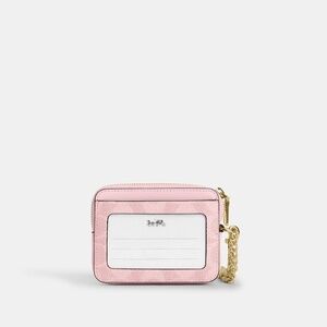 Signature coated canvas Two credit card slots ID window Open pocket Zip compartment Chain wrist strap with dogleash clip attached 3 (L) x 4 1/4 (H) x 3/4 (W) Style No. CW883