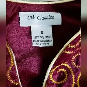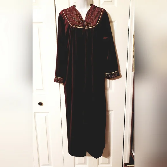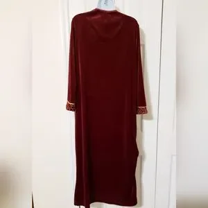 Deep red zip robe, comfy with gold embroidery on chest. No flaws, some reflection in photos. Excellent condition.