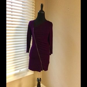 Vibrant purple tunic with burnished gold asymmetrical front zipper and gathered front & back seams for a most flattering cut!