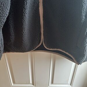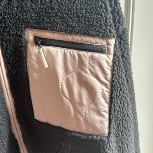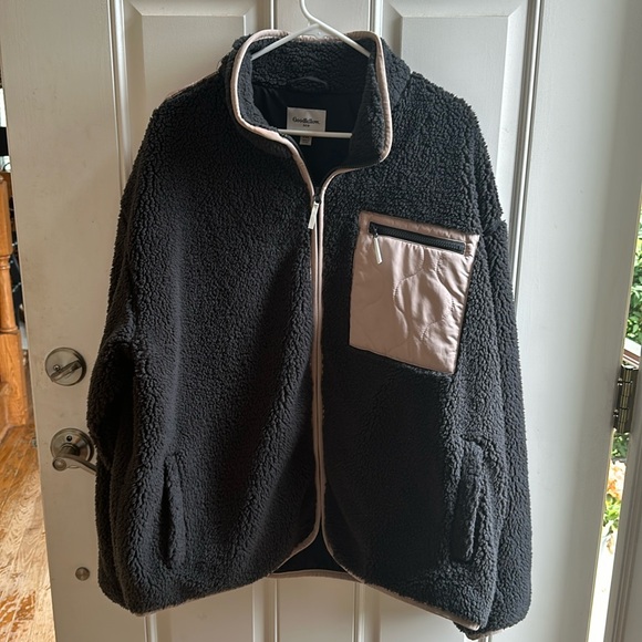 Goodfellow grey zip up jacket. Polyester material but fuzzy and soft material. Beige piping around the neck and zipper and front zipper pocket is beige quilted fabric. Same with upper back. Like brand new, maybe worn once.