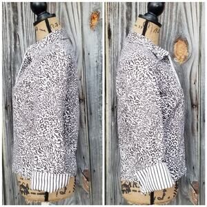 Lightweight shacket shirt jacket in dark brown & white mixed animal print: cheetah leopard zebra. Full zip front, fully lined. 3/4 length cropped sleeves w/ notched cuffs can be worn straight or turned back for contrasting striped detail. Issues noted in photos. Good preowned condition, overall. Size 8 by Joseph Ribkoff.