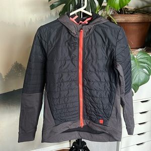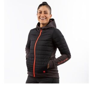 We boosted the capabilities of the traditional soft shell jacket with a super-breathable membrane and additional insulation for an ideal cold-weather riding jacket. Our Barrier fabric (100% recycled polyester with a DWR finish) blocks wind and moisture. For insulation, we used 100g Primaloft Gold insulation with Crosscore technology, which provides a surprising level of warmth without excess weight or bulk. Insulation is concentrated on the front of the chest and upper arms for warmth in core areas while still allowing for breathability while riding. We added a hood for pre- or post-ride comfort and versatility. From styling touches to fit, we make this piece specifically for women.