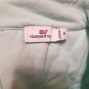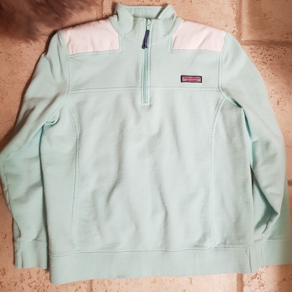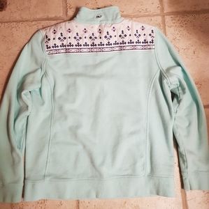 Mint/baby blue quarter zip lightweight sweatshirt. Has slight padding in shoulders which makes the sleeves a little shorter. Has cute design on the back, never worn! I would say it fits a smaller medium to a small more comfortably.