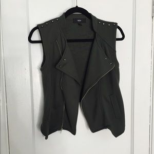 Olive green zip up vest. Stud detailing on the shoulder and collar. Longer in front than in back.