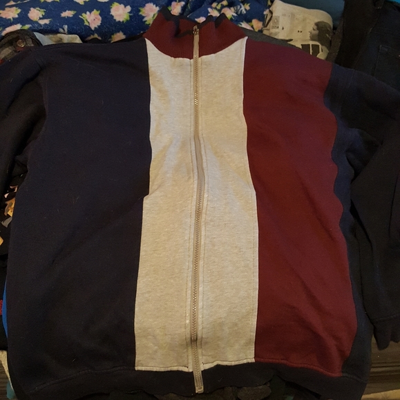 Color block zip up hoodie jacket. Burgundy, navy blue and gray. Can be dressed up or worn casual. M/L