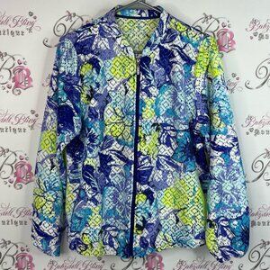 Stylish jacket with a vibrant blue and green pattern. Perfect for adding a pop of color to any outfit. No size tags. Unsure of exact size see measurement.