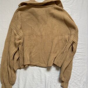A cozy cropped sweater in camel with a half-zip and fold-over collar. Soft ribbed knit delivers comfortable warmth. Easy-to-style silhouette for everyday looks.