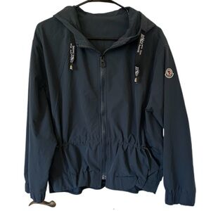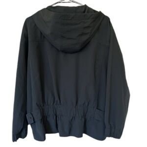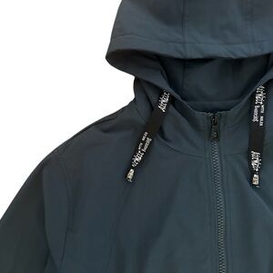 Front zip-up, Dual zipper pockets, Exposed zip closure center front, Logo applique at sleeves, Cinch cord with cord lock to adjust waistline, 2 side front pockets, Elastic cuffs, Approximate flat measurements; length 23", armpit to armpit 22", sleeve length 21", Material tags are missing but fits like a women's comfy medium (6-8), please check measurements, Blue /light navy blue/ in color
