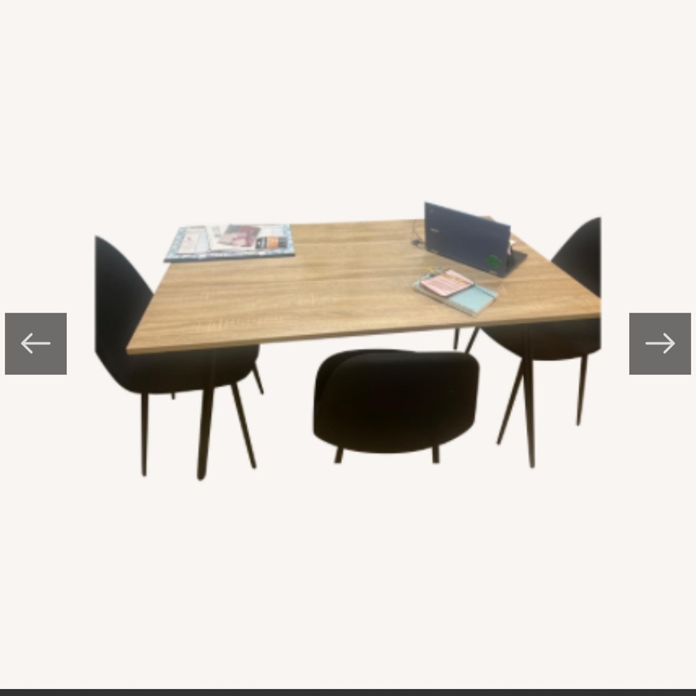 Top of the table is wood and the bottom legs are metal. Comes with four black chairs. Looks new. Have no scratches or stains.