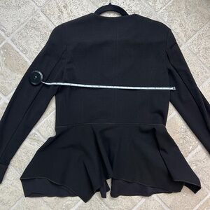 Black blazer with zipper. Never worn. Size 6 but sizes large. please refer to measurements on photos. Fits a size 8 well.