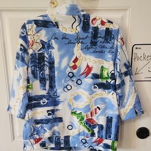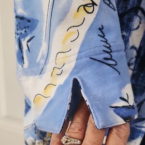 soft jersey blend in summer blues, red, white and yellow colors with zipper and 3/4 length sleeves with slit pockets on hips. Features unique patterns and playful motifs. Stylish and eye-catching in like new condition.