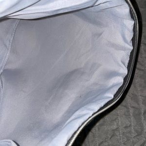 Attached tags. It was a gift that contained cosmetics previously. There is a mall mark probably from skin cream or similar product (please see photos)