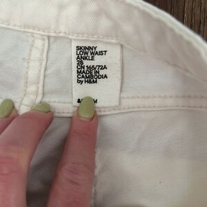 28 inch inseam. 15 inches across the waist. No stains, holes and in great condition. Crisp white with 5 inch functional zipper at the ankles. Summer casual!