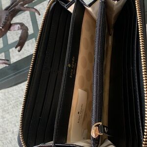 Never used. Chic wallet featuring playful polka dots on a black background. Ideal for adding a fun touch to your style.