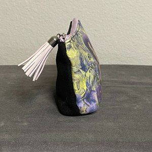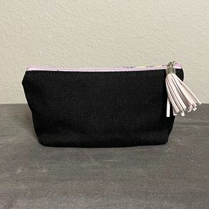 Small fabric makeup bag, purple zipper tassel. Quote on bag "I Have Too Many Shoes! Said no woman ever!"