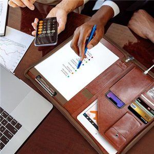 🧿1. Multiple Compartments: This padfolio has 1 A4 clipboard, 1 A4 document sleeve, 1 mobile phone pockets, 5 card slots with a ID window, 1 gadget pocket with fastener and 1 pen holder.