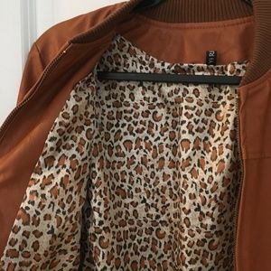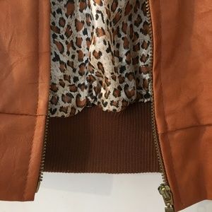 Super cute tan faux leather jacket, perfect for summer nights and fall! Zippered with cute leopard print interior lining. Barely worn, in excellent condition!