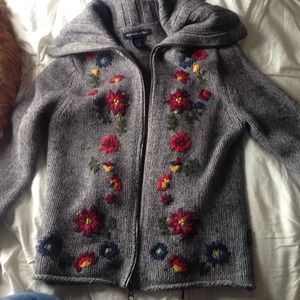 Gray zip-up sweater with multicolored flowers. 70% cotton, 15% wool, 15% nylon. Worn twice