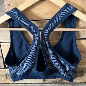 Stylish activewear set with geometric patterns. Includes leggings and sports bra. Features navy and gray design with yellow accents. Size medium
