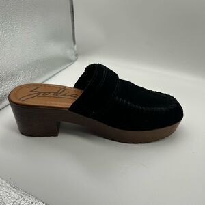 Slip on clog from Zodiac. Black suede upper with buckle detail. Padded insole. 2.25” heel. Size 8.5. Good preowned condition with minimal wear. See photos for full condition.