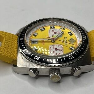 This is a beautiful unisex Zodiac Sea Dragon 100m / 330 feet Chronograph Diver Yellow Dial Yellow Rubber Strap Swiss Watch.