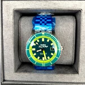 This watch is brand new, fully stickered, includes the factory stainless steel bracelet, hang tag, and presentation box. The bracelet features a polished and brushed finish with Zodiac logo clasp, and the caseback displays the signature Zodiac emblem. A unique, eye catching diver that showcases the brands famed color driven design language.