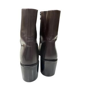 Features: 2.5'' heel, Ankle style. Mid stacked block heel. Almond toe. Brown color. Side zip closure.