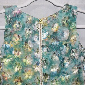 Stunning dress! Covered with 3D floral appliques. Velvet ribbon at waist. Center back zipper. Layers underneath skirt for added fullness. labeled size 14 but chest measures a bit smaller in the chest than what I have seen as typical measurements. Listing as a 12 because of measurements. Chest 30, waist approx. 27, length approx. 32.5 inches. In new condition with tag attached and Real Real tag inside. Tag looks like it was poked or stapled. Otherwise excellent new condition.