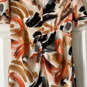 abstract print midi dress from Zoe and Claire. Designed with a flattering V-neckline and short sleeves, this dress boasts a fitted waist and flared skirt. The dress features a zip closure. This dress is fully lined and comes with ruched detailing on the front that adds texture and interest.